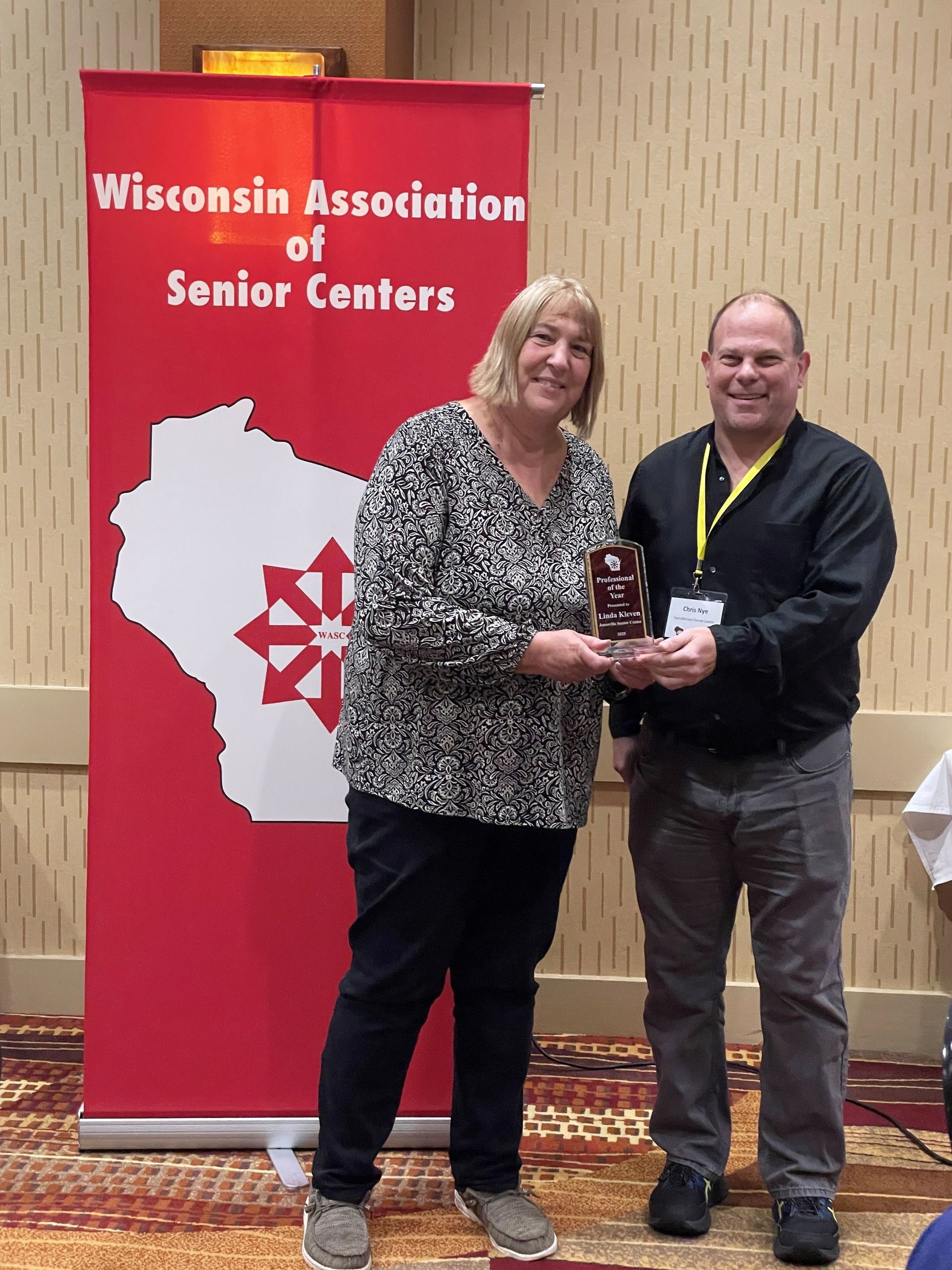 This award is the highest yearly award given out by the Wisconsin Association of Senior Centers (WASC). The Professional Excellence award recognizes achievements by a Director of a Senior Center that are above and beyond the ordinary. Those achievements can be a combination of WASC related duties and performances and exceptional accomplishments within the director’s center.